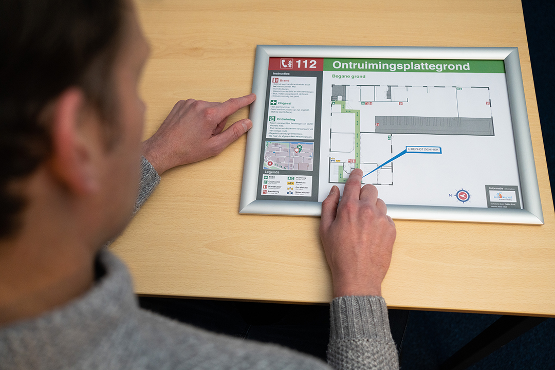 Om een veilige en spoedige ontruiming van een gebouw mogelijk te maken is een Ontruimingsplattegrond een belangrijk instrument. Wij beschikken over de kennis en middelen om voor u een duidelijke ontruimingsplattegrond op te stellen, conform de geldende norm en in uw huisstijl.